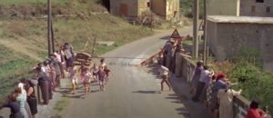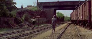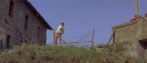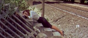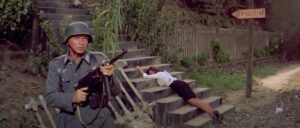 Frank Sinatra nei panni di un ufficiale tedesco guarda verso la cinepresa imbracciando con sguardo truce un fucile mitragliatore, dietro di lui a qualche metro di distanza, abbandonato sui primi gradini di una scala di cemento, c’è il corpo di una donna in plastica posizione post mortem cinematografica. Le hanno appena sparato mentre tentava di fuggire da un treno fermo per rifornimento e il sangue, non troppo, come si conviene a una manieristica convenzione cinematografica, risalta su una candida camicia bianca. Il personaggio del film si chiama Gabriella e fa parte della schiera dei “cattivi” visto che è l’amante italiana di un ufficiale tedesco, anche lui fatto fuori nella stessa scena. Possiamo immaginare la delusione degli spettatori dell’epoca per vedersi privati, più o meno a metà film, della presenza sensuale e seducente di una giovanissima e lanciatissima Raffaella Carrà, uccisa a pochi metri dalla stazione ferroviaria di Anagni, dove è stata girata questa drammatica scena.