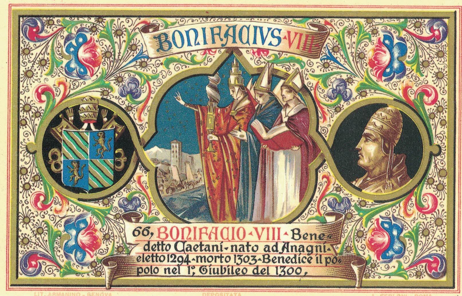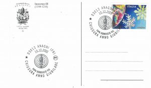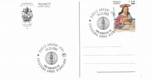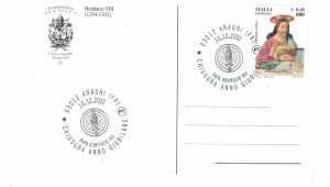 Nell’anno 1300 il pontefice anagnino Bonifacio VIII, al secolo Benedetto Caetani, indisse il primo anno santo della chiesa cattolica. Sette secoli dopo, in occasione del giubileo del 2000, tra le innumerevoli iniziative che caratterizzarono quella solenne occasione ci fu anche una manifestazione filatelica con la realizzazione di un annullo filatelico di Poste Italiane dedicato Bonifacio VIII e più in generale ai papi originari di di Anagni. L’evento si svolse il 10 dicembre 2000 in concomitanza della chiusura dell’anno giubilare.