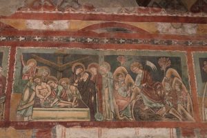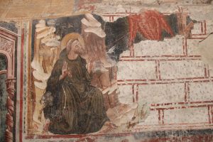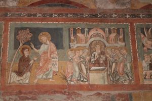 Dopo il controllo dei green pass un gruppo di circa 50 persone, molte delle quali giunte da fuori Anagni, si è incamminato sulla ripida scalinata della chiesa seguendo le spiegazioni del prof. Tommaso Cecilia che ha raccontato le vicende del sito e illustrato le caratteristiche della chiesa e del ciclo di affreschi disposto lungo una parete di 12 metri che oltre all’ultima cena  raffigura anche gli altri episodi  della passione di Cristo: l’entrata in Gerusalemme,  la lavanda dei piedi, la cattura, la flagellazione, il giudizio davanti a Pilato, la deposizione nella tomba e la missione degli apostoli.