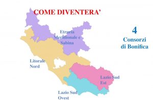 In ambito regionale i Consorzi stanno ridefinendo e razionalizzando la propria struttura organizzativa. A tele scopo sono previste per il futuro quattro macro aree: Etruria meridionale e Sabina, Litorale Nord, Lazio Sud Ovest con il litorale e la Pianura Pontina e Lazio Sud Est dove ricadranno Anagni e la Provincia di Frosinone.