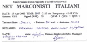 Di li a qualche mese sulle bande marittime ci sarebbe stato un silenzio quasi assoluto, interrotto solo dalle 2 o 3 stazioni che ancora marcano il canale con il loro call in telegrafia. In ricordo di quel periodo e di quella particolare vertenza sindacale via radio mi rimane la cartolina QSL firmata da Gianni, marconista dell’Espresso Ravenna (ICKV) che a 23 anni di distanza, insieme al ricordo di questa insolita vertenza lavorativa, abbiamo il piacere di condividere con i nostri lettori.
