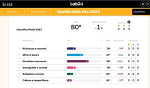La rilevazione de “Il sole 24 ore” analizza ovviamente anche le singole voci che concorrono alla classifica finale e anche qui la situazione non è rosea. Il peggiore risultato in assoluto è quello relativo alla “cultura e tempo libero” con un pessimo 91° posto e perdita di due posizioni, mentre per quanto riguarda la voce “ambiente e servizi” si ha un crollo verticale di 15 posizioni che la pongono all’87° posto. Trend negativi anche se più contenuti per “Ricchezza e consumi” 79° con -3 posizioni e “Demografia e società” 79° con -4 posizioni.
