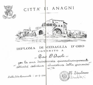 L’anno successivo, tra il 7 e il 9 settembre 1952, il Gruppo Corale partecipa al prestigioso Concorso Polifonico Nazionale nella Città di Arezzo ottenendo il secondo posto assoluto che però lascia l’amaro in bocca a direttore e coristi. Secondo molte testimonianze d’epoca e i commenti della stampa locale il gruppo migliore sarebbe stato proprio quello anagnino ma per ragioni meramente campanilistiche la giuria avrebbe assegnato il primo premio a una formazione locale. Questo incidente di percorso non rallenta la frenetica attività di D’Avoli e del suo Gruppo Corale che ritroviamo il giorno di San Magno del 1954 all’inaugurazione della prima mostra di pittura “Città di Anagni”. Della giuria della mostra fanno parte Renato Guttuso, Giovanni Colacicchi, Mario Mafai, Corrado Cagli e il pittore-scrittore Carlo Levi autore di “Cristo si è fermato a Eboli” che apprezza l’esecuzione in termini entusiastici. Nel secondo dopoguerra la formazione diretta da D’Avoli riceve anche diversi inviti per presenziare alle manifestazioni ufficiali dei sindacati di ispirazione cattolica ma il primo maggio del 1955 è un’occasione davvero speciale. Il sindacato delle ACLI compie dieci anni e i festeggiamenti si svolgono in Piazza San Pietro alla presenza di Pio XII. Il Gruppo Corale in costume ciociaro esegue l’inno delle ACLI composto e diretto dal maestro Andrea Pirazzini e diversi brani tratti dal proprio repertorio.