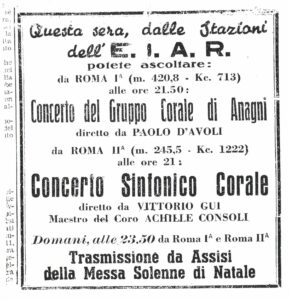 È in tale contesto che la sera del 6 dicembre 1937 gli italiani che possiedono un apparecchio radio ricevente e che sono sintonizzati sui 1357 KHz della stazione EIAR denominata Roma III, ascoltano in diretta un impegnativo concerto polifonico. Dagli altoparlanti delle popolari “Radio Balilla” e dei più prestigiosi ricevitori “Minerva” gli ascoltatori di tutta Italia possono apprezzare i canti popolari della nostra terra come la “Serenata a dispetto” o la “Ninna nanna”, raccolti e trascritti per soli e coro da Luigi Colacicchi che in quegli anni si va affermando come etnomusicologo di fama nazionale e che circa venti anni prima, da voce bianca, ha fatto parte del gruppo corale che sta eseguendo le sue rielaborazioni della musica tradizionale ciociara. Qualche giorno dopo il quotidiano “La Stampa”, sia pur con un linguaggio che riflette il clima dell’epoca, ne dà conto in termini molto lusinghieri: “Molto opportunamente hanno trovato posto nel terzo programma i canti popolari della nostra terra. Sere fa, il Gruppo Corale di Anagni, diretto da Paolo D’Avoli, ci ha fatto ascoltare alcuni canti della Ciociaria, raccolti e trascritti da Luigi Colacicchi. Trasmissione interessantissima; che ci ha convinto sempre più della necessità di tener viva l’attenzione dei colti e degli incolti sulla fresca e limpida vena che sgorga dall’anima del nostro popolo, acqua pura e dissetante che conserva intatte le qualità naturali della razza”. E’ solo la prima di tante esibizioni in radio. Dal 1937 al 1955 se ne conteranno oltre 40, alle quali vanno aggiunti altri 8 concerti all’interno di trasmissioni speciali dirette all’estero, mandate in onda dal Centro Radio Imperiale di Prato Smeraldo. Una di queste emissioni viene ricevuta nella città di Londra il 9 ottobre 1938 dai coniugi Sofia e Attilio Calderara, italiani residenti in Gran Bretagna, che in una toccante lettera al direttore del coro esprimono tutta la loro commozione per la musica ascoltata: “ …A renderla intensa non è stata solo la nostalgia della Patria ma la squisita esecuzione di canti bellissimi che tutta ci hanno detta la bravura del Direttore e la educazione artistica della massa corale”. Quelle voci appartengono al “Gruppo Corale di Anagni”, a dirigerlo è il Maestro Paolo D’Avoli che poco più di venti anni prima, nel 1915, ha rifondato la “Schola Cantorum” della cattedrale di Santa Maria Annunziata in Anagni e sulla base di questa esperienza ha sviluppato una intensa attività musicale in grado di coinvolgere l’intera città.