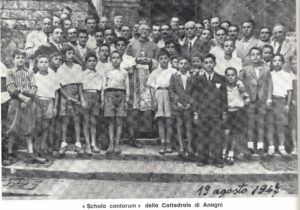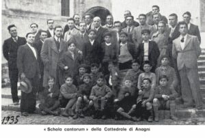 In questo lasso di tempo però Paolo D’Avoli sta lavorando a un progetto ancora più ambizioso: la formazione di un gruppo corale cittadino che fonda in un solo grande organico l’esperienza della Schola Cantorum, dalla quale provengono le voci virili e quella della Scuola Popolare di Canto dalla quale vengono aggiunte le voci bianche. Non è facile coordinare e fondere queste due esperienze musicali cosi lontane tra loro. E’ un lento e laborioso lavoro di amalgama che vede la luce solo 3 anni dopo, il 2 ottobre 1928, quando presso la sala della Ragione del municipio di Anagni il neo costituito Gruppo Corale si presenta con un impegnativo programma polifonico a quattro voci dispari (soprani, contralti, tenori, bassi) al giudizio del pubblico. E’ l’inizio di una esaltante avventura artistica che fa di Anagni una vera e propria “città della musica”. Il musicologo prof. Arnaldo Boreggi In “Vita Corale – Rassegna mensile di musicologia italiana” dopo aver evidenziato le eccellenze educative rappresentate dai tre collegi (Leoniano, Regina Margherita e Principe di Piemonte) presenti sul territorio, ne analizza anche l’effervescente vitalità musicale: “[…] Né il culto della musica vi è trascurato; ché Anagni anzi può essere citata ad esempio ad altre città di gran lunga più ricche e potenti […] Attualmente Anagni conta 3 attività musicali che si integrano e si completano; la “Schola Cantorum” della Basilica Cattedrale, il Gruppo Corale Anagnino e la civica banda. […] Per mezzo dell’una come dell’altro si possono svolgere in Anagni manifestazioni corali, sacre e profane, degne della massima considerazione”.